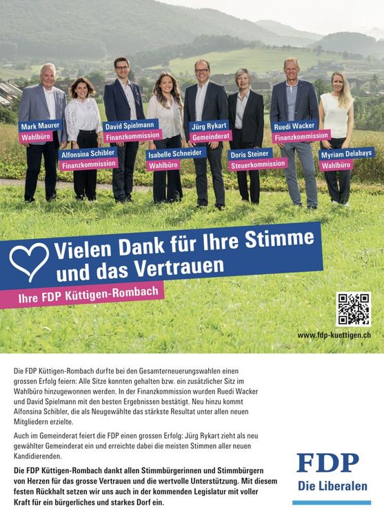 Vielen Dank für Ihre Stimme und das Vertrauen! Mit grossem Rückhalt aus der Bevölkerung setzen wir uns weiter mit voller Kraft für ein bürgerliches und starkes Dorf ein.